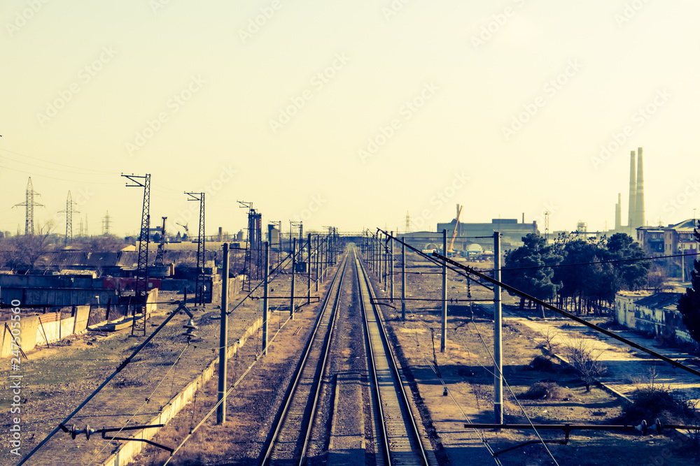 Railway lines. Road to infinity. Rails going far to horizon. Old railroad in an industrial town.