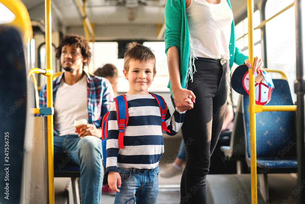 Mom holding son's hand and standing in the the public transportation. Kid looking at camera.