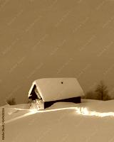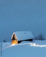 Fantastic winter landscape with wooden house in snowy mountains. Christmas holiday concept
