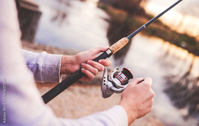 Angler enjoys in fishing on the river, close up photo. Sport, recreation, lifestyle