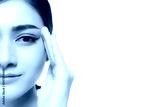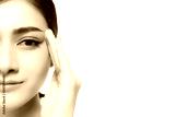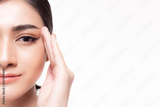 Perfect skin face concept. Closeup beautiful Asia model face with isolated on white background. Attractive beautiful woman has nice skin. Gorgeous girl has healthy skin. She touching her face softly