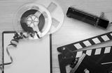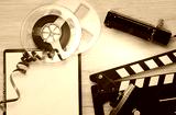 on a light background, film, old video camera, double for shooting and a clean notebook, with space for writing