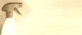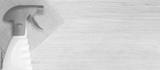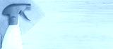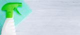 bottle with spray with cleaning liquid, on a green rag, on a light background, with a place for the inscription
