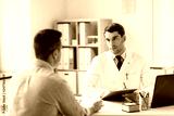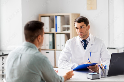 medicine, healthcare and people concept - doctor with clipboard talking to male patient at medical office in hospital