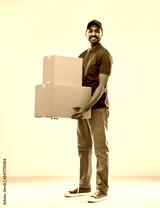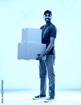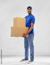 mail service and shipment concept - happy indian delivery man with parcel boxes in blue uniform over grey background