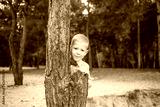 Portrait of cute white child standing at scenic landscape of countryside during summer vacations. Horizontal color photography.