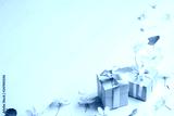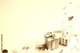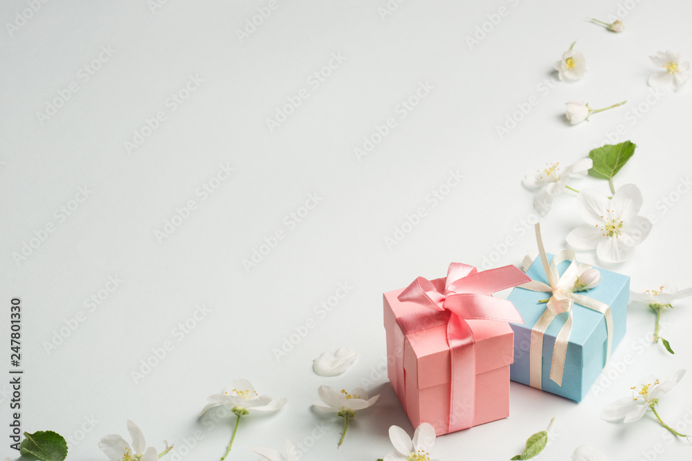 two gifts surrounded by Apple white flowers. blue and pink presents. pretty background
