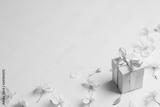 pink gift surrounded by Apple flowers. gentle background, copy space. present for mother's day, spring, Valentine's day, women's day