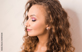 portrait beautiful young blonde curly girl posing in the studio with professional make-up and open tooth smile pink mood