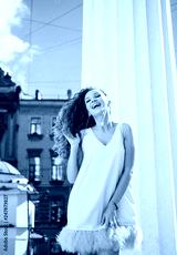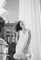 close-up portrait of a young beautiful sexy girl with curly hair in a pink feather dress smiling lifestyle on a street in sunny day