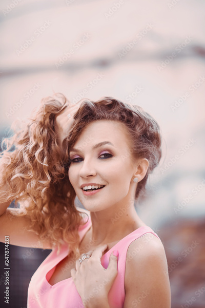 close-up portrait of a young beautiful sexy girl with curly hair in a pink feather dress smiling lifestyle on a street in sunny day