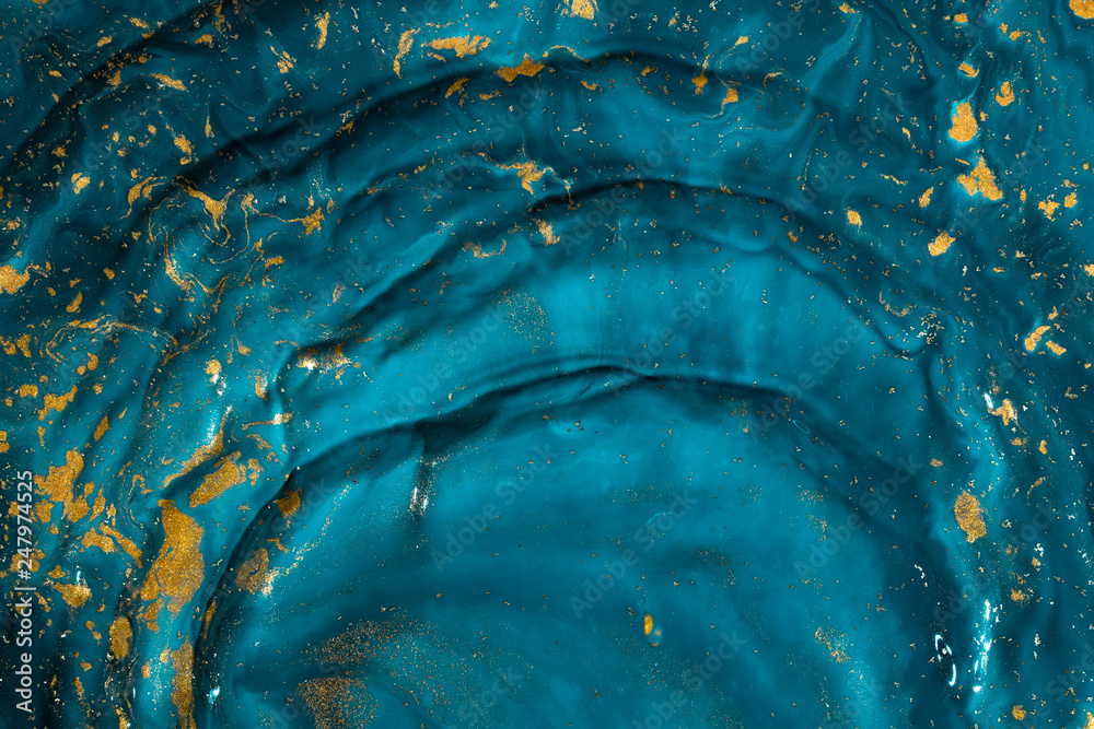 Abstract paint texture art. Natural luxury. Blue paint with gold glitter powder. Marble background.