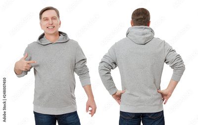 Middle age man in gray sweatshirt template isolated. Male sweatshirts set with mockup and copy space. Sweat shirt design front and back view.