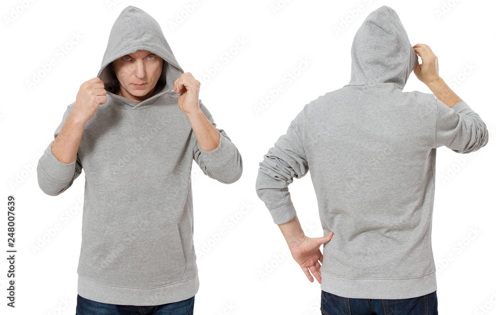 Man in template mens hoodie sweatshirt isolated on white background. Man in blank sweatshirt hoody with copy space and mockup for design logo print, Front and back view. Middle age man