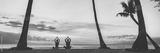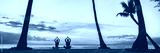 Yoga meditation retreat landscape panoramic banner - people meditating on sunset beach praying with hands above head sitting in lotus pose on nature background.