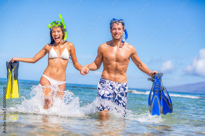 Happy summer fun couple on beach vacation swimming with snorkel equipment running in ocean water. Excited Asian bikini woman and Caucasian man on tropical holidays with flippers and mask.