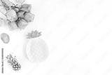 Top view of festive table setting concept. pineapple plate and gold pink cutlery on white background with roses flowers. Beautiful flat lay arrangement.