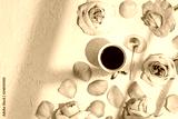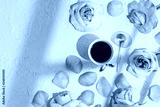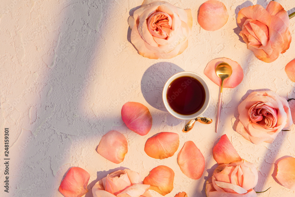 Cup of coffee with pink roses flowers and petals. Flat lay, top view with hard sun light and shadow on pastel concrete background