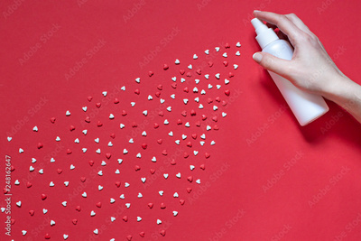 Abstract red valentines day flat lay. Top view card. Womans hand is spraying little hearts