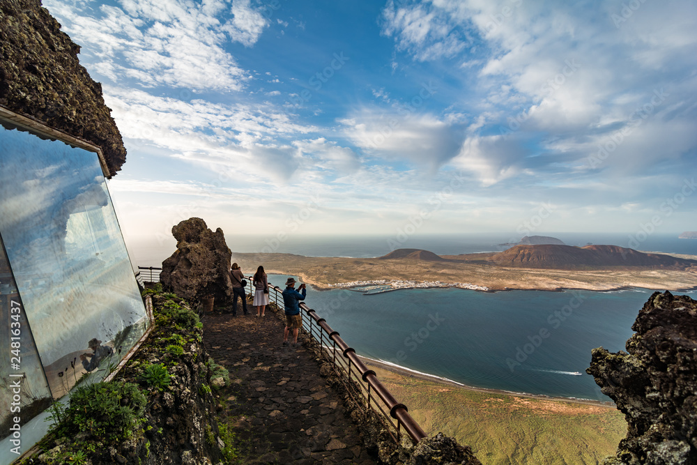 Lanzarote, Spain. Circa February 2019. Tourists visiting Mirador del Rio. Lanzarote. Canary Islands. Spain. Lanzarote viewpoint during sunset and La Graciosa island in the background.