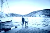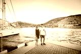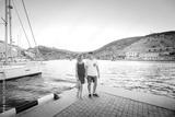 Young couple hugs and relaxing at dock near boat, on sunny summer day. Woman and man in fashionable clothes stands near luxury yacht. Luxury life concept. Couple in love travelling, honeymoon time.