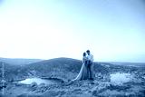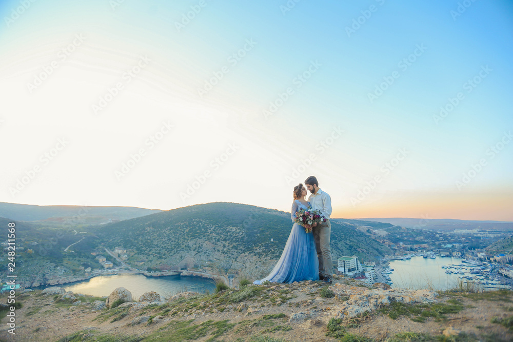 Sensual young couple in love standing on the rock in the sea near the beach with big cliffs. Man and woman holding hands and looking on each other