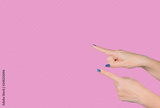 Closeup view of two beautiful female hands pointing with her index fingers at something virtual and invisible isolated on pink background. Horizontal color photography.