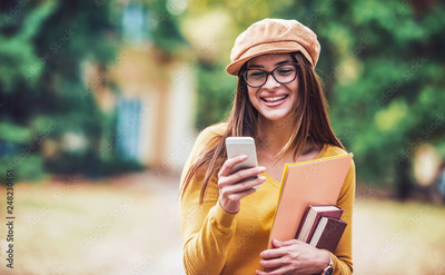 Campus life. Portrait of a young student with mobile phone and books. Education, fashion, lifestyle concept