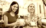 Friends meeting in a cafe. Young women drinking coffee and enjoying in conversation. Consumerism, lifestyle concept