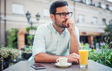 Young man sitting in the cafe and drinking coffee. Lifestyle concept