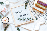 Hello spring concept flat lay on the white blanket. Breakfast in the bed top view card with text