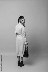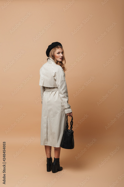 Young attractive woman in striped coat and black hat holding bag in hand thoughtfully looking in camera from back over beige background isolated