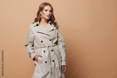 Young beautiful woman with wavy hair in striped coat sensually looking in camera standing over beige background