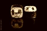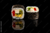 Concept of Asian cuisine. Two rolls of sushi with different fillings on a black background with the age for a Japanese menu for a cafe, restaurant, sushi bar.