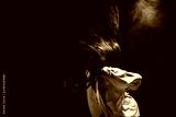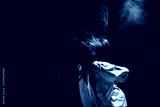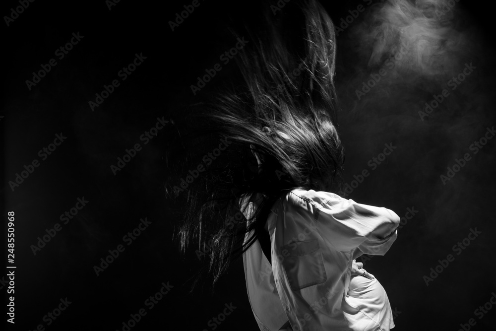 White Smoke Tan Skin Asian Woman black straight hair with Dense Fluffy Puffs of Fog on dark Background, Abstract high low exposure contrast, copy space for text logo, broken heart lonely girl can cry