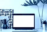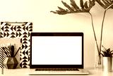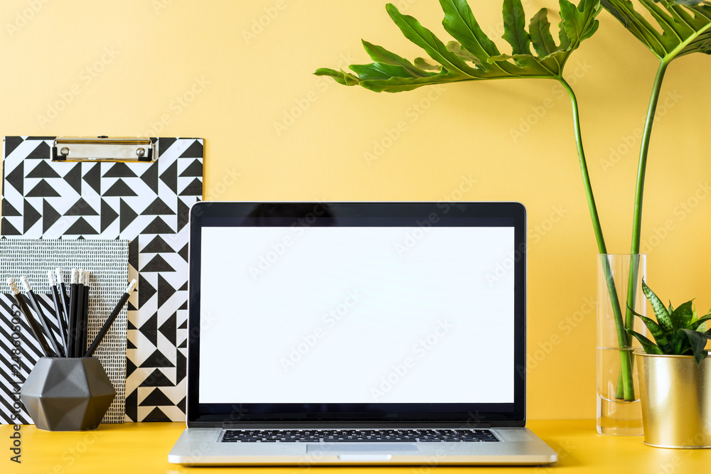 Office interior workspace with laptop mock up screen , office accessories notebook and flowers on the yellow background wall. Place for inscription. Homework, freelance.