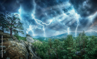 Lightning thunderstorm flash and sun lights in the mountains. Concept on topic weather, cataclysms (hurricane, Typhoon, tornado, storm)