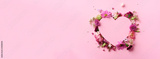 Creative layout with pink flowers, paper heart over punchy pastel background. Top view, flat lay. Spring, summer or garden concept. Present for Woman day. Banner