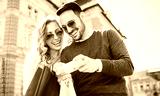 Dating. Young smiling couple having fun with smartphone after shopping. Love and tenderness, lifestyle concept