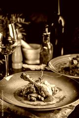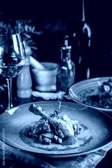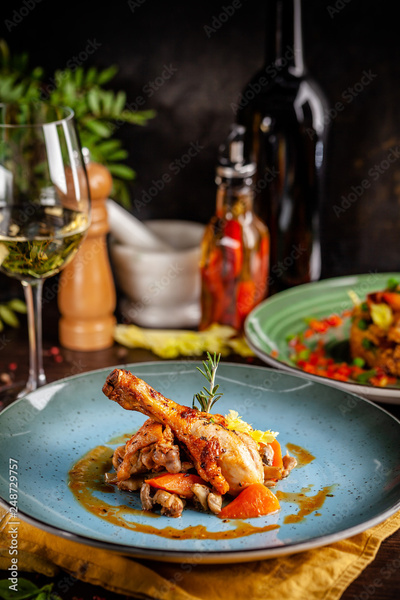 Concept of Italian cuisine. Stewed chicken in strong wine with vegetables. Serving dishes in a restaurant in a blue plate. White wine sherry in a glass on the table. Copy space