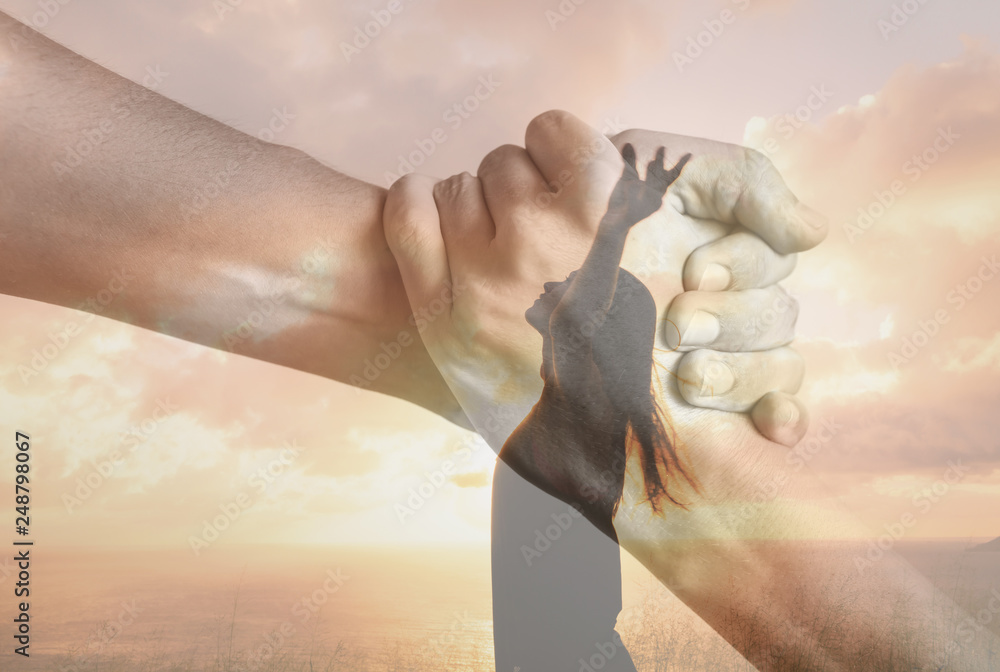 Happiness and freedom. Young at sunset woman with arms in the air. Giving a helping hand.