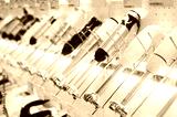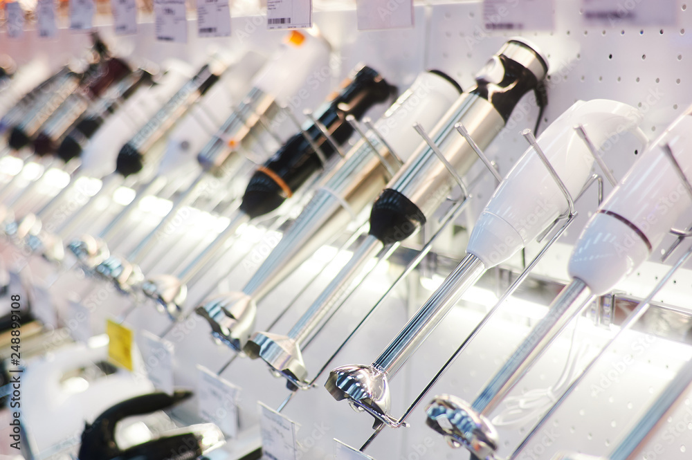 row of many blenders is on sale at showcase in store