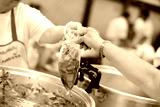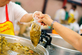Homeless people and hungry people line up, asking for free food from volunteers.