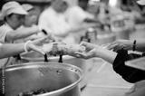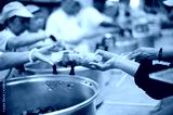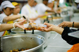 Homeless people and hungry people line up, asking for free food from volunteers.