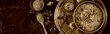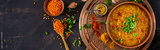 Indian dal. Food. Traditional Indian soup lentils. Indian Dhal spicy curry in bowl, spices, herbs, rustic black wooden background. Top view. Authentic Indian dish. Banner. Flat lay