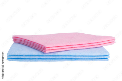 on a white background, two rags, blue and pink, for cleaning surfaces