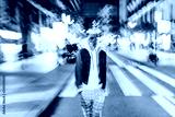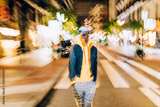 Moved image of African rapper man walking through the streets of Madrid, Spain.