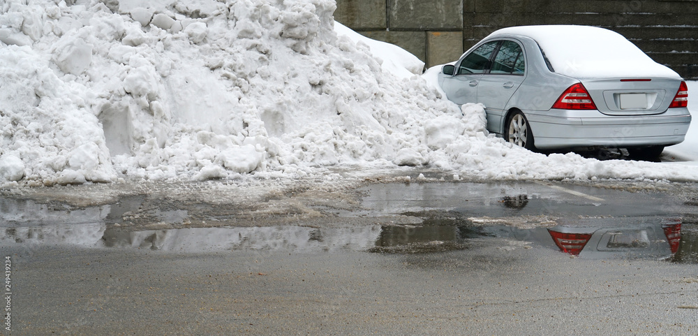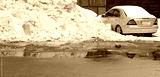 parking lots with high snow piles and car buried in snow