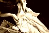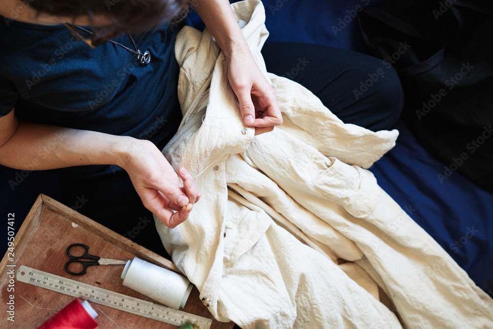 Workplace of seamstress. Dressmaker makingdetail, sew on buttons, spools of thread, tailor shop, tailoring, close up.