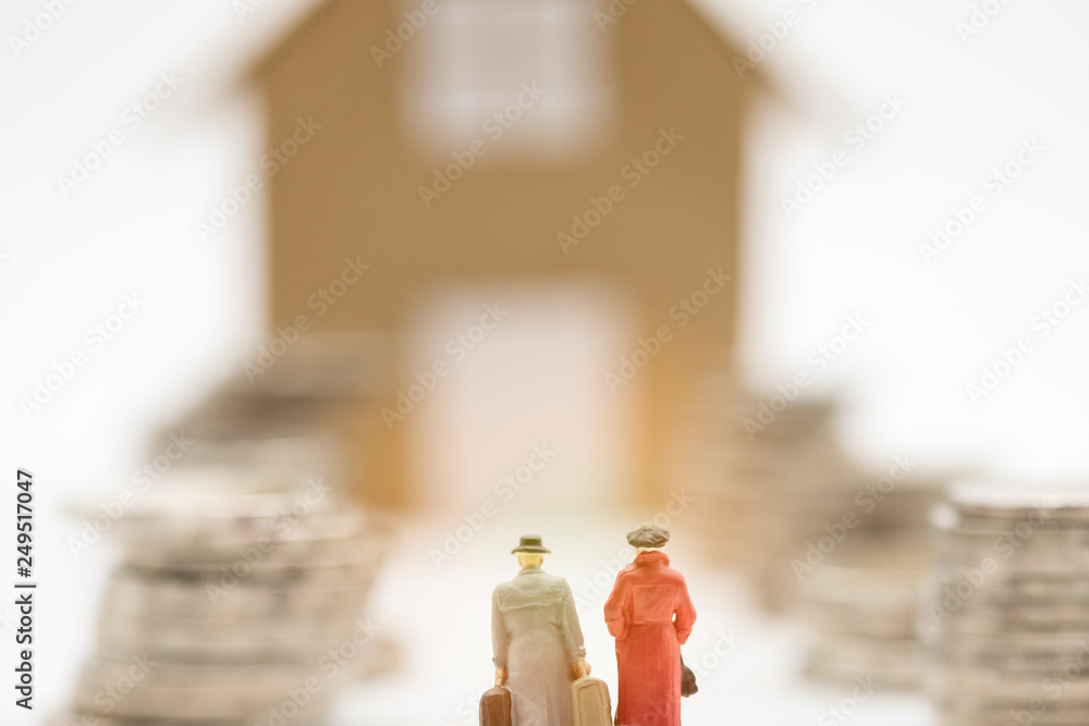 Behind miniature man and woman model hand carry suitcase and walk through coins stacking for move to new house. Starting new family concept.-Image.